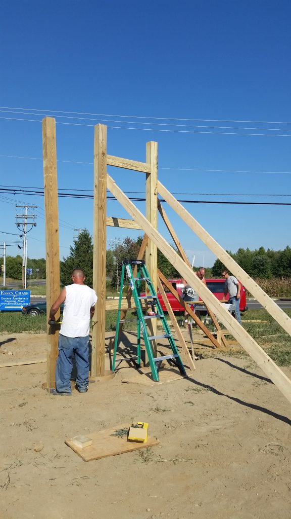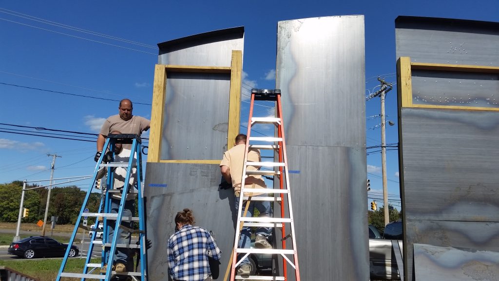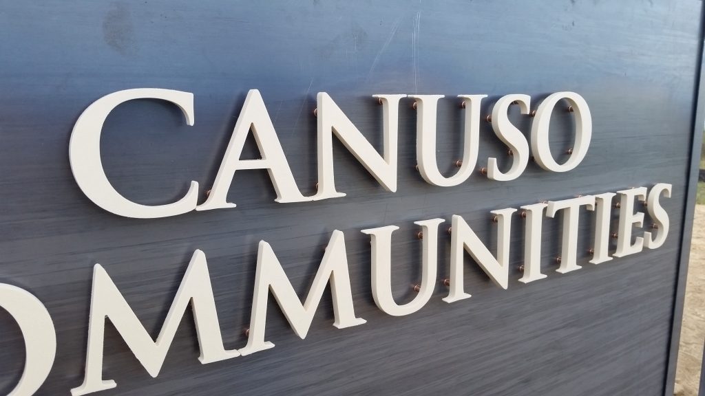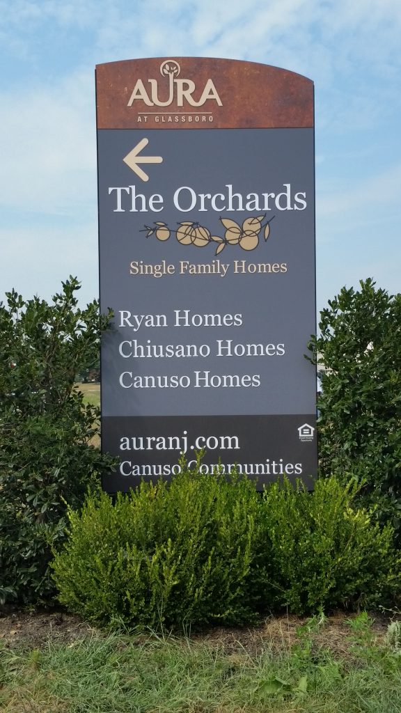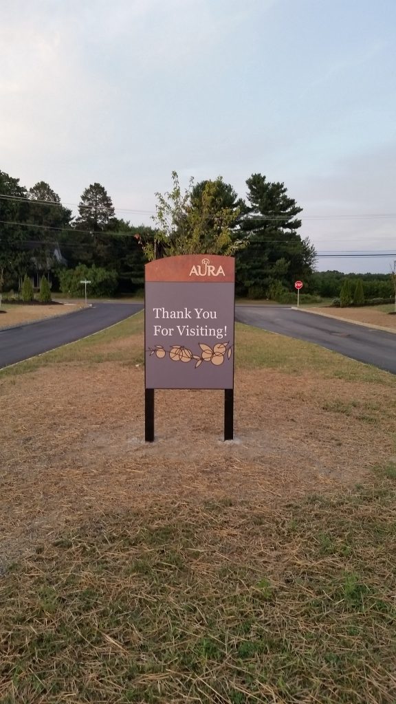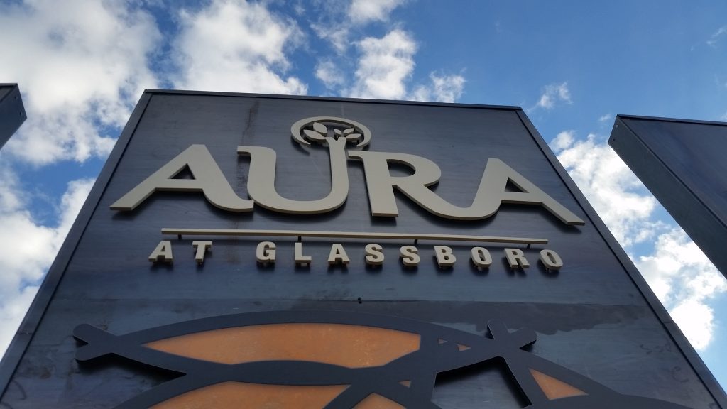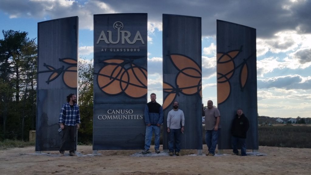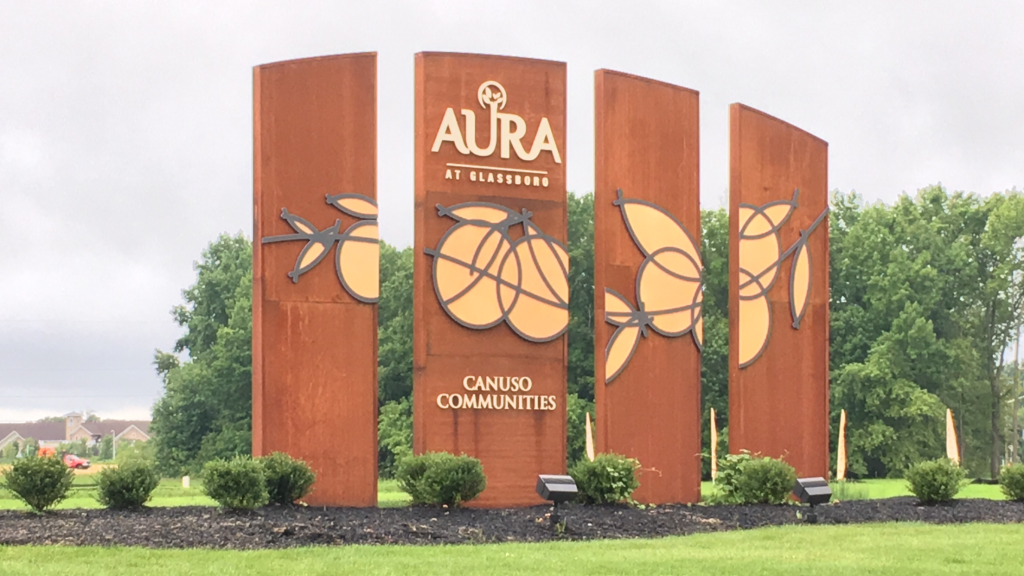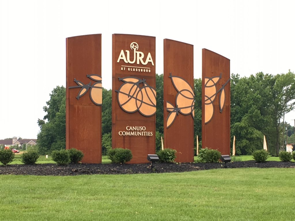 The Aura Monument main entrance signage was fabricated from weathering steel, which is manufactured to oxidize to a rich rust color without rotting. To preserve this effect, a metal finish was used to seal the steel, and dimensional letters extend from the surface with copper standoffs to complete the sign.