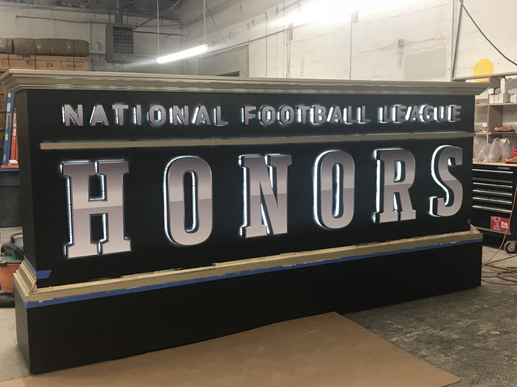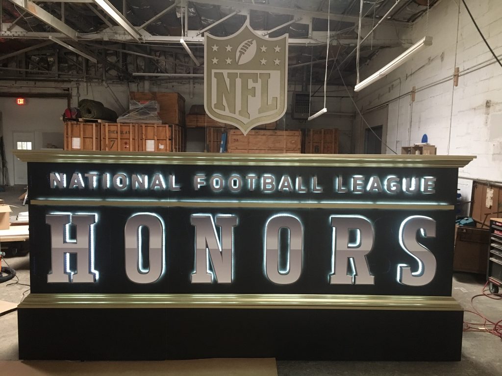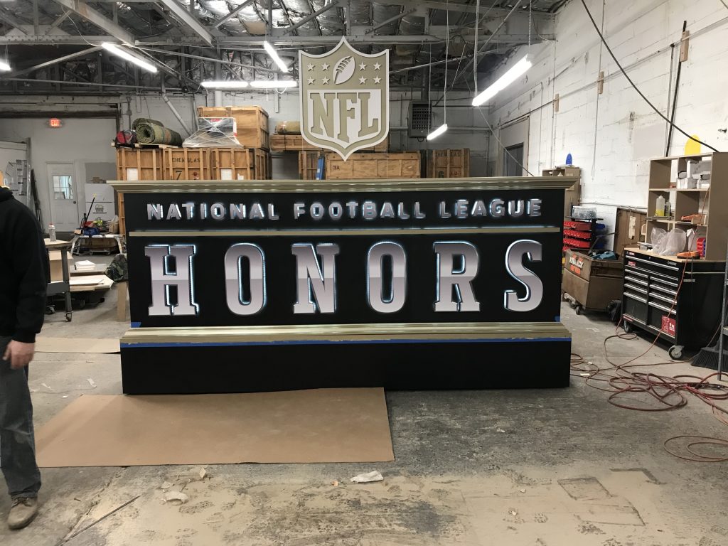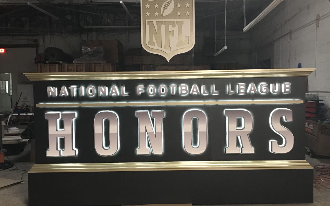 At the 2018 NFL Honors Ceremony in Minneapolis, Minnesota, we fabricated an entrance display to introduce the event and provide a memorable photo opportunity for guests. The display is complete with a “floating” NFL shield, dimensional letters with standoffs, and LED halo lighting. The entire display is collapsible into three cabinets with interior quick-connection wiring.